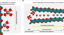 We performed XPS measurements for pristine, rinsed, and charged Na0.27MnO2 in conjunction with DFT calculations, shown in Fig.Ā 7. In this case, the charged Na0.27MnO2 is binder-free, which allowed for increased sensitivity to the Na0.27MnO2 compound (Supplementary Fig.Ā 24). When charged to 1.25āV, there is a decrease in the intensity of the Na peak due to the removal of Na-ions from the interlayer (Fig.Ā 7a). The corresponding valence band XPS measurements display only a slight change in the lineshape of the charged electrode compared to the pristine and rinsed samples likely related to the depopulation of states upon the removal of Na-ions. DFT calculations of the total density of states (TDOS) Na0.27MnO2 system weighted by the X-ray photoionization cross-section6 match well with the experimental spectra suggesting these calculations can be used to comment on Mn 3d-O 2p covalency (Fig.Ā 7b). When looking at the weighted O 2p and Mn 3d partial density of states, we find O 2p states contribute at the top of the valence band (0āeV to 2āeV). At 1486ākeV, the Mn 3d photoionization cross-section is over four times higher than the O 2p state so that in the unweighted DFT calculations the O 2p orbitals are the dominant contribution from 0 to 2āeV (Supplementary Fig.Ā 25), i. e., there is discernable Mn-O covalency in the Na0.27MnO2 so that we may have to consider a decrease in the negative-charge on the oxygen with Na-removal. While this highlights the role Mn-O covalency may play in Na-removal, we believe the water trafficking (co-deintercalation with Na-ion) at high potentials remains the primary factor in the observed shrinkage of the interlayer for Na0.27MnO2 for the following reasons. Firstly, compared to the LIB electrodes with an interlayer spacingā<ā3 Ć , the Na0.27MnO2 system has an interlayer spacing of 7.1 Ć . Thus, the oxygen-oxygen interaction between adjacent [MO6] layers in birnessite, which is inversely correlated to the square of the interlayer distance (\(\propto \frac{1}{{r^2}}\) where r is the distance between neighboring oxygen) is relatively weak compared to the NMC compounds. Moreover, the structural water within the interlayer of Na0.27MnO2 birnessite provides a āscreeningā effect that further weakens the OāO interaction, well described by Debye-Huckel theory.