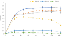Growth of S. oneidensis MR-1 on the metal-organic frameworks was measured by CFU counting, nucleic acid staining (Syto™ 9), extracellular protein staining (SYPRO™ Ruby), and total protein biomass (Bradford assay). Cultures containing 20 mM sodium lactate and either MIL-100, Fe-BTC, MIL-88A, or ferrihydrite ([Fe(III)]0 = 15 mM) in fresh SBM were prepared anaerobically and then inoculated with the washed S. oneidensis MR-1. CFU/Fe(III) reduction studies and total protein biomass studies used an inoculating OD600 = 0.002. Nucleic acid staining and extracellular protein staining reduction studies used an inoculating OD600 = 0.02 to increase the fluorescent signal. Abiotic samples were prepared with the materials in SBM with lactate but with no cells. The cultures were incubated anaerobically at 30 °C. For CFU counting, an aliquot of the culture suspension was removed and serially diluted (100–10−7). Each dilution (100 μL) was plated onto LB agar plates using sterile glass beads and incubated aerobically at 30 °C overnight. Individual colonies on each plate were counted and the initial concentration of S. oneidensis MR-1 was calculated. For the staining of bacterial nucleic acids, 200 μL of the culture suspension was removed and pelleted before removing the supernatant. The pellet was resuspended in 100 μL of 0.85% NaCl solution, mixed with 2x Syto™ 9 solution in a 96-well plate, and incubated at room temperature for 15 min in the dark. Fluorescence was measured with an excitation/emission of 485/530 nm using a BMG LabTech CLARIOstar Monochromator Microplate Reader. For the staining of biofilm matrix, 100 μL of the culture suspension was removed and pelleted before removing the supernatant. The pellet was mixed with 200 μL of 1x SYPRO™ Ruby fluorescent dye in a 96-well plate. The plate was incubated in the dark at room temperature for 15 min before measuring fluorescence at an excitation/emission of 460/640 nm using a plate reader. The nucleic acid fluorescence and extracellular protein fluorescence for biotic samples was corrected by subtracting the abiotic total measurement. For the total protein biomass measurements, an 850 μL or 900 μL aliquot of the suspension was pelleted (10,000 × g; 10 min) prior to resuspending in 90 μL of 0.5X SBM buffer. The samples were pelleted once more (10,000 × g; 10 min) and resuspended in 90 μL 0.1 M NaOH. The samples were sonicated in a Bransonic 28100 ultrasonic bath (Branson) for 10 min, then heated at 95 °C for 40 min, and pelleted a final time (10,000 × g; 10 min). The supernatant (10 μL) was mixed with 200 μL of the Better Bradford Reagent (ThermoFisher) in a 96-well plate and analyzed at 595 nm in a plate reader61. The measured total protein for biotic samples was corrected by subtracting the average abiotic total protein measurement. The corrected biotic values were used to normalize the Fe(III) reduction rate.