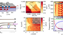 As already noticeable in Fig. 2e, we observe fluctuations of the ESR frequencies \(\Delta {f}_{\text{ESR}}={f}_{\text{ESR}}({t}_{2})-{f}_{\text{ESR}}({t}_{1})\) of both qubits in time. More detailed data is shown in Fig. 3a, where we track the ESR frequencies of both qubits over 140 min. There is no correlation between \(\Delta {f}_{\,\text{ESR}}^{\text{QD1}\,}\) and \(\Delta {f}_{\,\text{ESR}}^{\text{QD2}\,}\), indicating that any fluctuations are caused by a highly localized effect, consistent with a nuclear spin origin, and similar to observations that were published in ref. 10 on a different device. Figure 3b–g shows the histograms of \(\Delta {f}_{\text{ESR}}\) at three different magnetic fields for both qubits. We observe that the distribution of \(\Delta {f}_{\text{ESR}}\) becomes narrower as the magnetic field increases. To better quantify this effect, we plot the standard deviation of \(\Delta {f}_{\,\text{ESR}}^{\text{QD1}\,}\) as a function of magnetic field in Fig. 3h. The increase of this standard deviation at lower magnetic field is not easily explained by nuclear diffusion through dipole–dipole interactions, and suggests other mechanisms for nuclear spin flips40,41,42. As these mechanisms provide a critical limiting behaviour for frequency drift and therefore control fidelity, we seek a numerical model to explain it. The increased fluctuations at lower magnetic field point to the role of the electron spin in the dot, which may more easily drive nuclear spins when the electron and nuclear Zeeman energies are lower. There are several mechanisms which would show this behaviour qualitatively; to isolate which of these are most likely to lead to the observed phenomena, we must look quantitatively at the underlying hyperfine interactions.