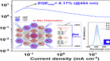 We fabricated and studied perovskite films with two different compositions in this study: 3D CsPbBr2.4Cl0.6 film and 2D–3D mixed CsPbBr3:PEACl film (molar ratio is 1:1 in precursor solution). Details about the film fabrication could be found in the Methods section. Chlorine was added in these films so that both films emit sky-blue light, with photoluminescence (PL) peaks at 486 nm for CsPbBr2.4Cl0.6 film and 487 nm for CsPbBr3:PEACl (1:1) film (Fig. 1a). The corresponding CIE coordinates are (0.06, 0.26) and (0.08, 0.25), respectively (Fig. 1b). Under the ultraviolet (UV) lamp, CsPbBr3:PEACl (1:1) film exhibits much brighter PL emission than the CsPbBr2.4Cl0.6 film (Fig.1c). Figure 1d shows PLQEs of CsPbBr2.4Cl0.6 film and CsPbBr3:PEACl (1:1) film under different incident laser intensities. Maximum PLQE of CsPbBr3:PEACl (1:1) film (19.8%) is much higher than that of CsPbBr2.4Cl0.6 film (1.1%). Phenylethylammonium halide incorporation in 3D perovskites usually introduces layered phases in the films, which has been demonstrated as an effective method to increase the PLQEs of green perovskite films23,24. Therefore, we focused on CsPbBr3:PEACl (1:1) perovskite in this study because of its higher PLQE compared with 3D CsPbBr2.4Cl0.6 film. PL spectra of perovskite films with different CsPbBr3:PEACl ratios are shown in Supplementary Fig. 1, which shows blue shift of PL peak from 522 nm for CsPbBr3 film to 487 nm for CsPbBr3:PEACl (1:1). Further increasing PEACl ratio in the films to CsPbBr3:PEACl (1:2) results in a much lower PL intensity and very broad emission band with multiple peaks, which might be from self-trapped exciton emission of different layered phases25. X-ray diffraction (XRD) study of the CsPbBr3:PEACl (1:2) film in Supplementary Fig. 2 clearly shows more layered phases are formed with the increased PEACl ratio in the films.