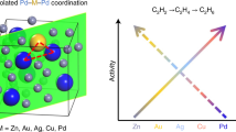 The number of moles of Pd atoms exposed on the surface was estimated by experimental measurement and theoretical prediction, respectively. For experimental measurement, the CO-pulse chemisorption (BELCAT-A, BEL, Japan) was measured at 50 °C using a He flow of 30 ml min−1 and pulses of 0.36 ml (9.88% CO in He). Prior to the analysis, the catalyst was treated with flowing Ar (50 ml min−1) at 400 °C for 30 min and then flowing He (50 ml min−1) at 400 °C for 15 min. To calculate the metal dispersion, a stoichiometry of Pd/CO = 1 was assumed. Because each Pd site was isolated by the surrounded Y atoms in the most stable surface Y3Pd2 (0001). The nearest separation between surface isolated Pd sites is ~0.43 nm, sufficiently longer than the bond length of CO molecule (~0.11 nm). In addition, the CO adsorption to Y powder was below the detection limit at the same condition. Therefore, it is reasonably assume each active ensemble of Pd-Y corresponds to one CO molecule. For theoretical prediction, both of the Pd atom numbers in one unit cell of Y3Pd2 crystal and surface area of the corresponding unit cell were calculated. Then the number of the Pd atoms per unit cell’s surface area were extended to the measured specific surface area of the experimentally prepared Y3Pd2 powder.