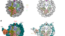 Nucleosomes for nucleosome-PU.1 interaction assays were assembled as described40. DNA fragments for assembly were produced via PCR from gBlocks ordered from IDT. Corresponding sequences are listed in Supplementary Table 2 and PCR primer sequences are provided in Supplementary Table 3. The DNA templates consist of a stretch of D.m. HSP70 promoter followed by the 601 nucleosome-positioning sequence (NPS). The PU.1 high-affinity binding motif 5′-CACTTCCTCTTT-3′11 was inserted at varying distances to the nucleosome border. Forward primers for DNA fragments with the PU.1-binding motif were labeled with Cy5. Forward primers for control fragments without a PU.1-binding motif were labeled with Cy3. Recombinant human PU.1 was expressed in Escherichia coli (Rosetta2(DE3)pLysS) with C-terminal FLAG- and N-terminal His-tags. The protein was natively purified using the His-tag on a Ni-NTA resin (Qiagen) via a gravity flow column. Protein concentration was determined via Bradford assay in comparison with bovine serum albumin (BSA) calibration solutions. Free DNA (50 nM) or nucleosomes were incubated with an excess of 4 mM recombinant PU.1 for 30 min at 30 °C in reaction buffer (20 mM Tris-HCl pH 7.6, 1.5 mM MgCl2, 0.5 mM EGTA, 300 mM KCl, 10% glycerol, 10 mM dithiothreitol (DTT)). The samples were then resolved on a 0.4× TBE 6% native PAA gel for 90 min at 4 °C and 130 V. The gels were subsequently scanned on a GE FLA-9000 instrument.