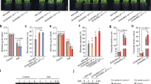 The net Na+ and H+ fluxes were measured using non-invasive micro-test technology (NMT) (Younger USA, LLC, MA, USA). In order to measure the net Na+ and H+ fluxes, five-day-old seedlings were treated with 100 mM NaCl solution (pH 8.0) for 24 h, then Na+ and H+ effluxes (Figs. 4e–j, g, h and 6d, f) were measured at primary root meristem zone (~500 μm from the root tip). In addition, the H+ fluxes at meristem zone of five-day-old seedlings treated with water (pH 8.0) for 24 h were analyzed (Fig. 6c, e). The NMT measurement procedures as follows: The backfilling solution (250 mM NaCl for Na+ measurement; 15 mM NaCl plus 40 mM KH2PO4 for H+ measurement) were filled into the pre-pulled and salinized micro sensor (⌀4.5 ± 0.5 μm, XY- CGQ -01) to a length of 1.0 cm, and then 50–60 μm LIXs (XY-SJ-Na for Na+ measurement; XY-SJ-H for H+ measurement) were filled into the tip of the micro sensor. The micro sensor was calibrated in the calibration liquid (0.1 mM CaCl2, 0.1 mM KCl, 0.3 mM MES, and 0.5 mM or 5.0 mM NaCl, pH 6.0 for Na+ measurement; 0.1 mM CaCl2, 0.1 mM KCl, 0.3 mM MES, pH5.5 or pH 6.5 for H+ measurement). The roots were incubated in the measuring solutions (0.1 mM CaCl2, 0.1 mM KCl, 0.3 mM MES, and 0.5 mM NaCl, pH 6.0 for Na+ measurement; 0.1 mM CaCl2, 0.1 mM KCl, and 0.3 mM MES, pH 7.0 for H+ measurement) for 10 min, then the Na+ or H+ net fluxes were measured and calculated using JCal V3.3 (Younger, USA)18.
