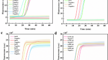 The fluorescence assay was performed with 10 nM purified LbuCas13a, 10 nM crRNA, 200 nM dual-labeled (FAM and BHQ1) RNA reporter probe and varying amplification product in 1 × reaction buffer (10 mM Tris-HCl, 50 mM KCl, 1.5 mM MgCl2, pH 8.3) at 37 °C for 30 min on CFX real-time PCR detection systems (FAM channel), and fluorescent kinetics were measured every minute.