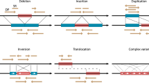 The classification heuristics are shown in Supplementary Fig. 8 and are summarised as: (i) inversion (INV): (l, u) directionality matches, i.e. (+, +) or (−, −), and there are 1 or 2 breakpoints corresponding to the inversion event; (ii) deletion (DEL): (l, u) directionality is (+, −), where l < u; (iii) tandem duplication (DUP) - breakpoint directionality is (−, +), where l < u; (iv) interspersed duplication (INTDUP): requires two breakpoints, (l, u)1 and (l, u)2 where l1 ≈ l2 (within 100 bp) and u1 ≠ u2 (one breakpoint has a tandem duplication signature and the other a deletion signature, i.e. (l, u)1 = (−, +) and (l, u)2 = (+, −)); (v) intra-chromosomal translocation (TRX): the same as an interspersed duplications, except with the presence of a third breakpoint (l, u)3, classified as a deletion that spans the mobile element: l3 ≈ u2, u3 ≈ u1 and (l, u)3 = (+, −). To successfully classify a translocation, the deletion ends must be within 6 bp (by default) of both ends of the mobile element; and (vi) inter-chromosomal translocation (INTRX) - the only criteria is that the chromosomes of l and u do no match, no directionality is considered.