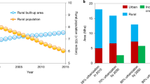 We use panel data regression to estimate future urban land areas based on the factors of population, urbanisation rate (percentage of urban population to total population) and gross domestic product (GDP). Here panel data regression refers to a regression method that simultaneously uses cross-sectional and longitudinal data. We follow the region definitions in the SSP database (https://tntcat.iiasa.ac.at/SspDb), which aggregate the world’s countries into 32 macro regions according to the conditions of geographic location and income level (i.e., high-income, mid-income and low-income levels). The historical urban land areas for the years 1975, 1990, 2000 and 2014 are acquired from the Global Human Settlement Layer (GHSL) dataset56 (Here urban land refers to artificial cover and paved surfaces). The concurrent statistical data of population, urbanisation rate and GDP are obtained from the World Bank57 and United Nations58. We then apply the built panel data regression model to project the urban land areas for each scenario based on the predictions of future population, urbanisation rate and GDP, which are available in the SSP database.