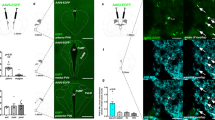 For the specific inhibition of the projecting neurons from PL to NAc core (Fig. 3g), mice followed a similar experimental design as described above with a modification in the surgical intervention. In this experiment, a dual viral approach was performed to selectively silence the PL neurons that project to NAc core (retro-DREADD approach): bilateral intracranial injection of AAV-hM4Di targeting the PL and of AAV-retrograde-Cre targeting the NAc core. To verify viral expression, mice were perfused at the end of the experiment and the fluorescent reporter mCherry was visualized in brain slices, as previously described. Cre-recombinase expression was detected by immunofluorescence using an anti-Cre recombinase antibody (see section Immunofluorescence studies in Supplementary Information). Same as in the previous experiment, in vitro electrophysiology recordings were used in a subset of injected mice to verify CNO-induced suppression of neuronal activity (see section In vitro electrophysiology in brain slices).