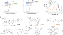 For the TA experiments, neat m-ITIC films were deposited by spin-coating m-ITIC solution in chloroform (CF) onto quartz substrates at 157 rad s−1 (1500 rpm) for 1 min, resulting in film a thickness of 9 nm (1.25 mg mL−1), as measured by a Dektak depth profilometer. Neat J61 films were prepared in a similar manner, spin-coated by using CF with a concentration of 1.25 mg mL−1. For bilayers, we prepared a poly(sodium 4-styrenesulfonate) (PSS) layer by spin-coating PSS solution in water onto a glass substrate, and subsequently spin-coated J61 onto the PSS. Next, the glass:PSS:J61 sample was placed upside down onto a m-ITIC-coated quartz substrate. A drop of water placed on the edge of these two substrates dissolved the PSS, resulting in the transfer of the J61 layer onto the m-ITIC layer (see Supplementary Fig. 12). The bulk heterojunctions were prepared by mixing the polymer and m-ITIC with either 1:1 or 5:1 mass ratio (with polymer concentration of 7.5 mg mL−1) in CF, and spin-coating this solution at 3500 rpm for 1 min. The absorption spectra were recorded with a PerkinElmer Lambda 950 spectrophotometer. For structural characterization by x-ray diffraction, the films were deposited on Si (100) substrates. The solar cells for sEQE and EL experiments were fabricated by using an ITO/ZnO/Active layer/MoO3/Ag architecture. ZnO was prepared by mixing zinc acetate and ethanolamine in 2-methoxyethanol, and then spin-coating onto pre-cleaned ITO substrates (ultra-sonicated in detergent, water, acetone and isopropanol), after which annealing at 150 °C was carried out for 30 min. The active layer was spin-coated in the same manner as the films prepared for the TA samples. MoO3 and Ag were then thermally evaporated as electrodes.