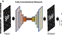 Figure 2 illustrates how the trained autoencoder processes the Dy2Ti2O7 scattering data. Figure 2a shows the raw experimental data Sexp(Q) while Fig. 2b shows how the autoencoder filters the experimental data to produce \(S_{{\mathrm{AE}}}^{{\mathrm{exp}}}\left( {\mathbf{Q}} \right)\). The autoencoder preserves important qualitative features of the data, while being very effective at removing experimental artifacts. Figure 2c shows the simulated data \(S_{{\mathrm{opt}}}^{{\mathrm{sim}}}\left( {\mathbf{Q}} \right)\) for the optimal Hamiltonian model Hopt, without any autoencoder filtering. We will describe later our procedure to determine Hopt. Note that the best model, \(S_{{\mathrm{opt}}}^{{\mathrm{sim}}}\left( {\mathbf{Q}} \right)\), is in remarkably good agreement with \(S_{{\mathrm{AE}}}^{{\mathrm{exp}}}\left( {\mathbf{Q}} \right)\). This agreement is consistent with the fact that the autoencoder was trained specifically to reproduce simulated data.