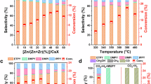 The CO2 hydrogenation was carried out in a tubular fixed-bed continuous-flow reactor equipped with gas chromatography (GC). 0.2 g of catalyst (40‒60 mesh) was diluted with 0.4 g of quartz sand (40‒60 mesh) in the catalyst bed. The reaction was conducted under reaction conditions of 1.0–4.0 MPa, 260–380 °C, V(H2:CO2:Ar) = 50:25:25, 60:20:20, or 76:19:5, GHSV = 3000–12,000 mL/g h. The emission gas (Ar, CO, CH4, CO2, and C2+ hydrocarbons) from the reactor was maintained at 130 °C and immediately transported to the sample valve of a Fu Li-9790 GC equipped with a thermal conductivity detector (TCD) and a Fu Li-9790 GC equipped with a flame ionization detector (FID). The liquid phase products (CH3OH) were collected in a cold trap and then analyzed with a Fu Li-9790 GC equipped with FID, with benzyl alcohol as an internal standard. Error bounds for the conversion and selectivity are ±0.3% and ±0.5%, respectively.