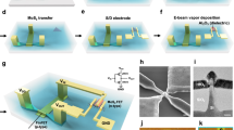 One of the most critical processes is the removal of planar part (defined as the plane-removing process) of the as-grown ML TMDs, which conformally cover the step edge. This is to retain only the 2D materials on the 300 nm side wall with an under layer of previously coated HfO\({}_{2}\), as shown in Fig. 2d, g and Supplementary Figs. 5 and 21. In the next step, a wet etch (Fig. 2h) was carried out to remove the 300 nm Si step, making the HfO\({}_{2}\)/TMD/HfO\({}_{2}\) sandwich structure vertically clamped by the S–D electrodes. A false-colored SEM image of the sketch shown in Fig. 2h is given in Fig. 2i, with the vertical blue belt (i.e., the HfO\({}_{2}\) supported ML-fin of vertical TMD nanobelt, more details can be seen in Supplementary Figs. 21 and 22) clearly seen. Next, shown in Fig. 2j, a gate metallization procedure was done after an ALD coating of HfO\({}_{2}\) gate dielectric on the basis of structure shown in Fig. 2h, i. Here, gate electrodes can be made by either metal deposition (see also Supplementary Fig. 23) or CNT-film deposition (see also Supplementary Fig. 24), as illustrated by the false-colored SEM images in Fig. 2k, l. It is noted that the ML-Fin can in principle consist of ML MoS\({}_{2}\), WS\({}_{2}\), and other thin films including CNT films, as indicated by the insets in Fig. 1b. Indeed, by replacing MoS\({}_{2}\) with WS\({}_{2}\) or CNT films, we found that the work flow in Fig. 2a–i a universal bottom-up route for fabricating FinFETs with sub 1 nm \({W}_{{\rm{fin}}}\) as its conduction channel.