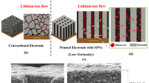 In-situ electrochemical dilatometer measurement and ex-situ SEM studies of the pristine electrode and the electrode at 100% SOC showed a consistent result of small electrode swelling (Fig. 4c–e). Figure 4c shows the swelling (red) of a typical high loading electrode upon cycling (black). The largest electrode expansion is ~21% at full lithiation and ~6% at delithiation states. Figure 4d–e are cross-section SEM images of a pristine electrode and an electrode after the first lithiation to 100% SOC. The electrode thickness before testing is ~50.7 µm in average [61.7 µm (the total thickness in average) − 11 µm (the thickness of Cu foil)], whereas the average electrode thickness at the first full lithiation is ~59.7 µm (70.7 µm − 11 µm). The electrode expansion at full lithiation is ~18.3% [(59.7 − 50.7)/50.7], consistent with the in-situ dilatometer result.