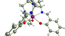 where \({\hat{H}}_{{\mathrm{A}}}\) is an Anderson Hamiltonian involving a single Nc orbital of the NiNc complex (see Methods section). The z-axis is chosen along the molecular axis running through the center of the Cp rings. Within this viewpoint, 1 is assigned to a spin excitation occurring between the ground state \(\left|S=1,\,M=0\right\rangle\) and the doubly degenerate \(\left|S=1,\,M=\pm1\right\rangle\) excited states of NiNc [see Fig. 2a], the onset ∣ϵ1∣ corresponding then to D. The fit to the line shape based on Eq. (1) is highly satisfactory [solid red line in Fig. 2a]34, and yields D = 4.6 ± 0.2 meV. The inclusion of many-body interactions in the fit through \({\hat{H}}_{{\mathrm{A}}}\), i.e., the inclusion of Kondo-like phenomena, is crucial for reproducing the cusp observed above the energy threshold of the spin excitation9,36,37. The cusp is associated to a Kondo fitting parameter \({\mathcal{J}}\rho =-0.4\pm 0.2\) that is typical for Nc on copper substrates (Supplementary Fig. 2 and Supplementary Note 1).