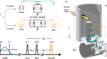 Figure 1 shows an image of a superconducting coplanar waveguide (CPW) quarter-wavelength (λ∕4) resonator used as a microwave cavity. The cavity is patterned from a ~60-nm-thick film of 60∕40 molybdenum-rhenium alloy (MoRe, superconducting transition temperature Tc ~ 9 K33) on a 10 × 10 mm2 and 500 μm-thick high-resistivity silicon substrate; cf. Methods section and Supplementary Fig. 1. For driving and readout, the cavity is capacitively side-coupled to a transmission feedline by means of a coupling capacitance Cc = 16 fF. The cavity has a fundamental mode resonance frequency ωc = 2π ⋅ 6.434 GHz and internal and external linewidths κi = 2π ⋅ 370 kHz and κe = 2π ⋅ 5.7 MHz, respectively. The transmission spectrum of the cavity around its resonance frequency is shown in Fig. 1e; for details on the device modeling and fitting, see Supplementary Note 2.