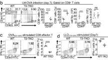 LCMV strain WE was provided by R.M. Zinkernagel (University of Zürich, Zürich, Switzerland) and propagated on L929 fibroblasts70,71. TnikF/F;Ubc-Cre mice and littermate controls were infected with 200 plaque-forming units (pfu) LCMV-WE. Alternatively, 1 × 105 MACS-purified p14 CD8+ T cells from p14;Tnik−/− mice or littermate controls were adoptively transferred to congenic BL/6 recipients. Eighteen hours later, mice were infected with 104 pfu LCMV-WE. Re-challenge experiments were performed using 2 × 106 pfu recombinant vaccinia virus expressing LCMV-glycoprotein G2 (rVV-G2)72. Alternatively, FACS-purifed gp33-specific CD8+ or p14 T cells were AdTf into secondary recipient mice followed by infection with 200 or 104 pfu LCMV-WE, respectively.