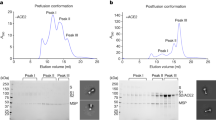 CD9 and EWI-2 were co-expressed in HEK293S GnTI- (N-acetylglucosaminyl-transferase I-negative) cells (American Type Culture Collection, catalog no. CRL-3022), using the BacMam expression system72. For protein expression, HEK293S GnTI- cells cultured in FreeStyle medium (Thermo Fischer Scientific) were infected at a density of approximately 3 × 106 cells ml−1 and incubated at 37 °C. After 16 h, sodium butyrate was added to the cells, which were further incubated for 48 h at 30 °C. The membrane fractions were collected by the same procedure as described above, and solubilized in 10 mM HEPES, pH 7.0, 150 mM NaCl, and 1% digitonin (Calbiochem) for 1 h at 4 °C. Insoluble materials were removed by ultracentrifugation (186,000×g, 30 min). The supernatant was mixed with ANTI-FLAG M2 Affinity gel (Sigma), and incubated for 1 h. After the incubation, the resin was washed with ten column volumes of 10 mM HEPES, pH 7.0, 150 mM NaCl, and 0.1% digitonin. The protein sample was then eluted with three column volumes of 10 mM HEPES, pH 7.0, 150 mM NaCl, 0.1% digitonin, and Flag peptide (0.1 mg ml−1). The eluted sample was mixed with CNBr-Activated Sepharose 4 Fast Flow beads (GE Healthcare) coupled with an anti-GFP nanobody (GFP enhancer)73, and incubated for 1 h at 4 °C. The beads were washed with ten column volumes of 10 mM HEPES, pH 7.0, 150 mM NaCl, and 0.1% digitonin, and further incubated overnight with TEV protease to cleave the His8-GFP tag. The collected flow-through fraction was then concentrated with an Amicon Ultra filter (molecular mass cut-off 50 kDa, Millipore), and further purified by gel filtration (Superose 6 Increase 10/300 GL column, GE Healthcare) in 10 mM HEPES, pH 7.0, 150 mM NaCl, and 0.1% digitonin.