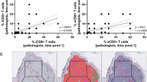 We next characterized the ITH of gene expression patterns in the tumor, to gain insight into the nature of local tumor-immune microenvironments. Unexpectedly, unsupervised hierarchical clustering based on transcriptomic profiling revealed limited association between regional gene expression and histologic features such as intratumoral site (e.g., “core” surrounded only by tumor mass vs. “margin” spanning the tumor edge and including surrounding tissue) (Fig. 2a and Supplementary Fig. 3A). We then used several immune deconvolution tools to enumerate separate immune, stromal, and tumor cell populations, as well as melanoma-, AXL-, and MITF-related gene expression programs11,12,13,14,15,16. Sub-regions with high content of one immune cell subset generally displayed an enrichment for multiple cell subsets, indicative of a broadly diverse infiltrating immune population, and consistent with the observed high correlations between immune cell marker stains by IHC (Fig. 2b, c and Supplementary Fig. 3B-C). Samples with higher immune activity were over-represented at tumor margin sites (p < 0.001, Fisher’s exact test), reflecting the spatially excluded (i.e., peri-tumoral) leukocytic accumulation observed on IHC (Fig. 2a and Supplementary Fig. 1). A notable exception was particularly high T- and B-cell signatures in multiple samples of section 8 (8A6, 8A7, 8A8, and 8A13), which was highly necrotic and displayed heavy neutrophil infiltration on matched formalin-fixed paraffin-embedded (FFPE) slices (CD15 stain; Supplementary Fig. 3D), although this could not be determined as the cause or consequence of necrosis. In many cases, high immune cell signatures were accompanied by high expression of interferon-stimulated genes. Relatively low levels of variability were observed in expression of genes linked to melanoma cell phenotype (i.e., melanocytic, MITF-related, and AXL-related gene sets); however, the same samples that displayed prominent and uniform immune signature upregulation also displayed a non-melanocytic phenotype that is known to be associated with mesenchymal-like and pro-invasive cellular behaviors, evidenced by high expression of the AXL-related gene set, and correspondingly low expression of the melanocytic and MITF-related gene sets (Supplementary Fig. 3A)17,18.