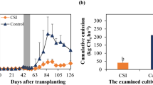 Following the microelectrode measurements, the pots were taken out of the water tank and any remaining water on top of the soil was carefully removed. Pots were placed into a custom-made opaque PVC chamber (inner dimensions: 91 cm height, 14 cm diameter) with a rubber septum at the top and incubated up to 2.5 days. Headspace samples of 500 µL were withdrawn with a syringe and directly injected into a gas chromatograph (310 C, SRI Instruments, United States) equipped with a flame ionization detector.