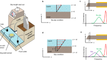 Utilizing experimental values for HL60 cells moving at a flow rate of 1.015 µl s−1 (Qsh = 1000 nl s−1, Qsa = 15 nl s−1) inside a w = 14 μm virtual channel of a cuvette with a side length of 360 µm we obtain a velocity of \(u_c = 2.8\,{\mathrm{cm}}\,{\mathrm{s}}^{ - 1}\) and a stress at the liquid–liquid interface of \(\sigma _{\mathrm{i}} = 78\,{\mathrm{Pa}}\). In comparison to the hydrodynamic shear and normal stress, \(\sigma _{\mathrm{i}}\) dominates (Supplementary Fig. 8) thus inducing cell deformation predominantly perpendicular to the direction of flow (Fig. 4c, bottom). For the calculation, viscosity values of \(\eta _{{\mathrm{sa}}}\left( {\dot \gamma } \right) = 11\,{\mathrm{mPa}}\,{\mathrm{s}}\) were taken from FEM simulations and independently confirmed using calibration beads with a fixed elastic modulus of \(E = 1.5 \pm 0.5\,{\mathrm{kPa}}\) (see Methods)42.