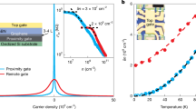 First, we demonstrate the screening effect qualitatively. Figure 1c shows that the vicinity resistance \(R_{\mathrm{V}}\) is notably affected if a thin gate dielectric is employed. Vicinity measurements are discussed in detail in ref. 12 but, briefly, an electric current is injected through a narrow contact into a wide graphene channel. The negative voltage drop arising locally from a viscous electron flow is detected using a vicinity contact at a short distance \(L\) from the current-injecting contact (Fig. 1a). One can see from Fig. 1c that, as \(T\) increases, \(R_{\mathrm{V}}\) first decreases and then becomes negative. This indicates a transition from the ballistic transport regime (positive \(R_{\mathrm{V}}\)) into a regime where ballistics is strongly affected by e–e scattering13. The minimum in \(R_{\mathrm{V}}(T)\) corresponds to the condition \(\ell _{{\mathrm{ee}}} \approx L\) and indicates an onset of hydrodynamic behavior13. As \(\ell _{{\mathrm{ee}}}\) decreases further with increasing \(T\), \(R_{\mathrm{V}}\) becomes less negative and eventually positive, being dominated by currents caused by electron–phonon scattering12,13. The dependences \(R_{\mathrm{V}}(T)\) shown in Fig. 1c were measured for two similar devices at the same \(L\). One had \(d \approx 300\,{\mathrm{nm}}\) (conventional Si back gate) whereas the other was made using four-layer hBN as the gate dielectric. Despite the similar behavior of \(R_{\mathrm{V}}(T)\), the curve for \(d \approx 1.3\,{\mathrm{nm}}\) is clearly shifted to higher \(T\). The shift direction indicates that the nearby gate causes an increase in \(\ell _{{\mathrm{ee}}}\), which is equivalent to a reduction in electron temperature by ∼\(30\,{\mathrm{K}}\). Note that for \(T\) above \(100\,{\mathrm{K}}\) where the hydrodynamic regime develops, electron transport in high-quality graphene is universal and insensitive to experimental details.