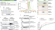 To determine whether SHLD3 mediated REV7 conformational dimer is essential for binding to SHLD2, we performed gel filtration assay. Because SHLD2(1–60) cannot be expressed solely in a soluble state, we fused a MBP tag to its N terminus, which is designated as MBP-SHLD2(1–60). As shown in Fig. 5a and Fig. 5b, MBP-SHLD2(1–60) forms a stable complex with REV7WT-SHLD3(1–82), but not with mutant REV7R124A-SHLD3(1–82) that fails to form the conformational dimer, indicating that C-REV7-SHLD3(1–82) without O-REV7 fails to interact with MBP-SHLD2(1–60). Although MBP-SHLD2(1–60) is excessive, only a part of REV7WT-SHLD3(1–82) forms stable complexes with MBP-SHLD2(1–60) (Fig. 5a, labeled in black in both left and right panels, 12.5 ml–13 ml). This is in consistence with our previous SEC-MALS data, which shows that our recombinant expressed REV7WT-SHLD3(1–82) is not homogeneous and is composed of C-REV7-O-REV7-SHLD3(1–82) and C-REV7-SHLD3(1–82) (Supplementary Fig. 3b). This can be confirmed by the observation that the ratio of REV7 to SHLD3(1–82) is higher in the peak eluted at 12.5–13 ml than in the peak eluted at 14.5–15 ml (Fig. 5a, 9.6/1.0 versus 8.0/2.5, the gray values are labeled in black box in right panel). As REV7R124A-SHLD3(1–82) solely does, REV7E35A-SHLD3(1–82) solely fails to form conformational dimer and thus fails to interact with MBP-SHLD2(1–60) (Fig. 5c, pink line). As expected, the reconstituted conformational dimer utilizing asymmetric REV7E35A or REV7K44A and REV7K129A mutations form stable complexes with MBP-SHLD2(1–60) (Fig. 5c, black and red line), while REV7K129A-SHLD3(1–82) and REV7K129A reconstituted much weaker conformational dimer form fewer complexes with MBP-SHLD2(1–60) (Fig. 5c, blue line). This was further confirmed by ITC experiments, in which the binding affinity of REV7E35A-SHLD3(1–82) and REV7K129A-SHLD3(1–82) to REV7K129A in the context of MBP-SHLD2(1–60) is 60 ± 19 nM and 410 ± 150 nM, respectively (Supplementary Fig. 5a, b). Moreover, REV7E35A-SHLD3(1–82) and other mutants that fail to form the conformational dimer also show only weak interaction with MBP-SHLD2(1–60) in the pulldown assay (Fig. 5d, lanes 9–12). In contrast, in presence of REV7K129A, MBP-SHLD2(1–60) shows stronger interaction with REV7E35A/K44A-SHLD3(1–82) that form reconstituted conformational dimer utilizing asymmetric REV7E35A/K44A and REV7K129A mutations than with REV7K129A/K190A-SHLD3(1–82) that fails to form the conformational dimer with REV7 K129A (Fig. 5d, lane 13 and 14 versus lane 15 and 16). Taken together, we demonstrate that C-REV7-SHLD3(1–82) without O-REV7 fails to interact with MBP-SHLD2(1–60), and mutation interfering the C-REV7-O-REV7 interface impairs the assembly of the SHLD3-REV7-SHLD2 complex.