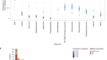 To determine what proportion of P/LP variants detected in our dataset are harbored within potentially druggable genes, we cross-matched our gene list with the drug-target network database generated by our group10,11. This database contains 13,567 drug–target pairs connecting 2248 targets and 1703 US FDA-approved drugs. From 1507 patients, 511 (34%) had at least one P/LP variant on a gene that is potentially druggable. One hundred twenty-seven (8.4%) patients had KCPG P/LP variants, and an additional 384 (25.5%) individuals had P/LP variants in druggable candidate genes. About one-third of these patients (161 individuals), 72 individuals with KCPG P/LP variants, and 89 with candidate genes P/LP variants had existing FDA-approved antineoplastic and immunomodulating-related compounds. The P/LP genetic alteration of these patients was located on 73 genes, 19 KCPG, and 54 candidate genes. We had eight individuals with two druggable genes. C-AYA patients with adrenocortical carcinoma had the highest number of patients with druggable genes (45.5%), followed by patients having sarcomas including soft tissue sarcomas (14%), Ewing sarcomas (12.6%), and osteosarcomas (11.6%). Patients with CNS tumors, retinoblastoma, Wilms tumor, and neuroblastoma were next, each with 10% of their cases carrying druggable alterations. Patients with low-grade glioma, with 4.2%, had the lowest number of individuals with druggable events (Fig. 5; Supplementary Data 19–20).