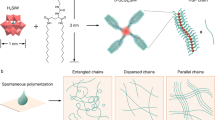 Dynamic light scattering (DLS) analysis proved that 1∙2S in dodecane (4.0 mM) formed polymeric aggregates with hydrodynamic diameter of 20 nm (Supplementary Fig. 2a, upper, 298 K). This polymerization was promoted by the hydrogen-bonding interactions between the salt-pairs 1∙2S; such polymeric aggregates did not form when the hydrogen-bonding sites in 2S were protected by methylation (Supplementary Fig. 3a–c). Owing to the dynamic nature of hydrogen bonds, the DLS hydrodynamic diameter of the polymeric aggregates of 1∙2S was decreased from 20 to 1 nm as temperature increased from 298 to 348 K (Supplementary Fig. 2a). Atomic force microscopy (AFM) indicated that the polymeric aggregates were one-dimensional stacks of the salt-pair 1∙2S with >200 nm length and ~4 nm width (Fig. 2f).
