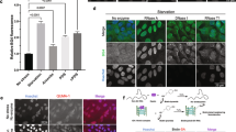 For cell fractionation, cells were gently resuspended in 500 µl of hypotonic lysis buffer (10 mM Tris pH 8.0, 1.5 mM MgCl2, 10 mM NaCl, 1 mM DTT) and vortexed for 4 s. After centrifugation at 1000 g (4 °C) for 5 min, supernatant (cytosolic fraction) was recovered. Pellet fraction (washed twice with hypotonic lysis buffer) was resuspended in 500 µl lysis buffer A (10 mM Tris pH 8.0, 140 mM NaCl, 1.5 mM MgCl2, 0.5% NP40, 1 mM DTT). The supernatant (microsomal fraction) was recovered. Pellet-nuclear fraction (washed twice and resuspended in 500 µl of lysis buffer A) was transferred to a 5-ml round-bottom tube and 50 µl of detergent mix (3.3% (w/v) sodium deoxycholate, 6.6% (v/v) Tween 40) were added. After incubation on ice for 5 min, the supernatant-postnuclear fraction was recovered (perinuclear fraction). The pellet-nuclear fraction (washed with buffer A) was resuspended in 500 µl of lysis buffer A supplemented with 0.1% SDS and sonicated. After centrifugation at 1000 g (4 °C) for 5 min, supernatant (nuclear fraction) was transferred into a fresh tube.