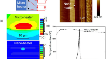 We show electrostatic control of gap, from 500 nm to 100 nm, between a suspended metallic emitter and the underlying Ge photodetector. We extract the displacement of the emitter surface by using the known initial gap (d0) and measured change in capacitance caused by displacement of the bridge due to applied actuation potential (Va). We confirm that the bridge is suspended and obtain the initial gap (d0 ~ 500 nm) by performing an atomic force microscopy (AFM) measurement between the suspended bridge and the photodetector surface (see Supplementary Note 4). The measured initial gap is found to be more than the thickness of deposited sacrificial layer (\(t_{{{{\rm{SiO}}_2}}}\) ~ 300 nm) due to bowing of the bridge under film-stress. The change in capacitance between the suspended bridge and the gate electrode as a function of actuation (emitter-gate) potential (Va) is measured using a vector network analyzer39,40,41. The details of measurement setup are provided in the Supplementary Note 7. Using the initial capacitance (C0 = ϵ0 ⋅ Aactuator/d0, where ϵ0 = 8.85 × 10−12 F m−1) and measured change in capacitance for different gate-emitter potential, the displacement of the suspended bridge-emitter is estimated. Figure 3 shows the gap between the emitter and the photodetector surfaces as a function of applied actuation potential Va (0 V ≤ Va ≤ 1 V). One can see that the gap can be reduced from 500 nm down to ~180 nm for an applied potential of ~1 V. In order to ensure that observed change in capacitance is indeed due to displacement of suspended bridge-emitter, we perform another measurements using an unreleased device (sacrificial layer intact) and find negligible change in capacitance under influence of actuation potential. The measurement results are fitted with an electrostatic actuator model with non-linear spring response to estimate the displacement. The details of the fitting procedure along with the parameters and the raw data of the measured change in capacitance from a released and unreleased device are provided in Supplementary Note 7. The multiple flexures holding the central bridge, the film-stress and the partly overlapping actuation electrodes contribute to non-linear spring-like behavior allowing us to achieve gaps much smaller than those imposed by the pull-in limit of standard electrostatic actuator42,43,44. We initially restrict the calibration measurement of our nano-electromechanical system (NEMS) at 1 V to avoid any unwanted damage to the device prior to heat transfer measurements. The measurements shown here are performed under vacuum (Pchamber < 8 × 10−5 Torr) to overcome the limitation of low breakdown voltage of air (Vb ~ 0.4 V) at extremely small distances (d ≤ d0) in our devices.