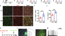 As shown in Fig. 1d–f, compared with NS-injected mice, CFA-injected mice had more nNOS-expressing neurons co-labeled with c-Fos (a widely used indicator of cell activation) as well as total c-Fos+ cells in the vmPFC at 4 h after injection. nNOS-expressing neurons are classically divided into two types based on nNOS immunofluorescence: type I (strongly labeled) and type II (weakly labeled). CFA-induced neuron activation occurred in both types of nNOS-expressing neurons (Supplementary Fig. 2). To determine whether vmPFC nNOS-expressing neurons were indeed involved in the control of anxiety-like behaviors induced by chronic pain, we specifically manipulated the activity of this neuron population through chemogenetics. First, we expressed hM3Dq, a clozapine N-oxide (CNO)-based excitatory designer receptor exclusively activated by designer drugs (DREADD), using an adeno-associated virus (AAV-hSyn-DIO-hM3Dq-eGFP) in the vmPFC of nNOS-Cre mice (Fig. 1g). Three weeks later, eGFP fluorescence verified the accurate expression of hM3Dq (Fig. 1h). hM3Dq-eGFP was expressed in both type I (marked by arrows, approximately 10%) and type II (marked by arrowheads, approximately 90%) nNOS-expressing neurons (Fig. 1i). Cre-dependent expression in type II nNOS neurons was also confirmed using AAV-hSyn-DIO-mCherry-infected nNOS-Cre mice (Supplementary Fig. 3a, b). Moreover, fluorescence in situ hybridization (FISH) also indicated that Cre-dependent mRNA expression was specific to nNOS neurons (Supplementary Fig. 3c, d). Increased action potential (AP) firing of hM3Dq-eGFP-expressing neurons after CNO application to brain slices indicated the efficient stimulation of these neurons (Fig. 1j). Behavioral tests performed 30 min after CNO or NS microinjection showed that chemogenetic activation of nNOS-expressing neurons in the vmPFC caused obvious anxiety-like behaviors; this was revealed by both the OF test (Fig. 1k) and EPM test (Fig. 1l), but there was no influence on locomotor activities (Fig. 1k, l). We also confirmed the above behavioral effects using novelty-suppressed feeding (NSF) (Fig. 1n) and light–dark box (LDB) (Fig. 1o) tests. Interestingly, we did not find any mice that showed mechanical (Fig. 1m) or thermal (Fig. 1p) hyperalgesia in this experiment. To further determine whether the anxiety-like behavioral phenotype was exclusive for the activation of nNOS-expressing neurons, we also microinjected AAV-hSyn-DO-hM3Dq-eGFP into the vmPFC of nNOS-Cre mice to stimulate Cre-negative neurons (Supplementary Fig. 4a, b) and found no alterations in anxiety-like behaviors (Supplementary Fig. 4c–e), but there was a clear trend suggesting an analgesic effect (t24 = 2.040, p = 0.053, Student’s t-test).