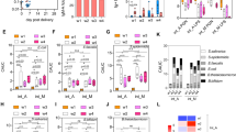 Microbiota analysis was performed on 9 newborns per group, and measurements were acquired at enrolment (T0) and visit 2 (T2). DNA was extracted from 200 mg of faecal samples with G’NOME DNA isolation kit (MP Biomedicals) following a published protocol54. Briefly, faecal samples were homogenised in the supplied cell suspension buffer. RNase mix and Cell lysis/denaturing solution were then added, and the samples incubated at 55 °C for 30 min. Protease mix was added, and the samples incubated at 55 °C for 2 h. To improve cellular lysis, 750 μL of 0.1-mm-diameter silica beads were added, and samples were put in a Beadbeater (MP Biomedicals) (ten cycles at maximum speed for 45 s). Polyvinylpolypyrrolidone (15 mg) was added, and the samples were vortexed and centrifuged at 20,000 g for 3 min. The supernatant was recovered. The remaining pellet was washed with 400 μL of TENP [50 mM Tris (pH 8), 20 mM EDTA (pH 8), 100 mM NaCl and 1% polyvinylpolypyrrolidone] and centrifuged at 20,000 g for 3 min. The washing step was repeated twice more, and the resulting supernatants pooled. The supernatant collected was centrifuged at 20,000 g for 3 min, and 750 μL were transferred in a clean 2-mL microcentrifuge tube. Nucleic acids were precipitated by addition of 1 ml of isopropanol, storage at −20 °C for 20 min and centrifugation at 20,000 g for 5 min. The pellet was dried with the speed vacuum, and then resuspended in 400 μL of distilled water plus 100 μL of salt-out mixture, and incubated at 4 °C for 10 min. Samples were centrifuged at 20,000 g for 10 min, and the supernatant containing the DNA was transferred to a clean 1.5-mL microcentrifuge tube. DNA was precipitated with 1.5 mL of 100% ethanol at room temperature for 5 min, followed by centrifugation at 20,000 g for 5 min. Residual ethanol was removed using speed vacuum. DNA was resuspended in 150 μL of water and stored at −20 °C. Partial 16S rRNA gene sequences were amplified from extracted DNA using primer pair Probio_Uni/Probio_Rev, which target the V3 region of the 16S rRNA gene sequence (see Supplementary Table 4)55. 16S rRNA gene amplification and amplicon checks were carried out, and 16S rRNA gene sequencing was performed using a MiSeq (Illumina) at the DNA sequencing facility of GenProbio srl55. Following sequencing, the.fastq files were processed using the QIIME2 software suite56. Quality control was performed with the DADA2 pipeline, and reads were truncated at the first instance of a quality score less than or equal to 20. A phylogenetic tree was built using fasttree and mafft alignment, and diversity measures (alpha- and β-diversity indices) were calculated. Community richness (alpha-diversity) was evaluated by Chao1 index and represented by box-and-whisker plot. Community dissimilarities (β-diversity) were quantitatively evaluated by weighted UniFrac distance57 and represented by a PCoA plot. Q2-feature-classifier, trained on the SILVA132 99% OTUs58, specifically on the V3 region, was used to perform taxonomic classification. Differential abundance of bacterial genera was tested by ANOVA and TukeyHSD post hoc analysis for multiple comparison (P < 0.05). Microbiota taxa showing different abundance trends (T0–T2) according to delivery–diet groups were identified with ANOVA. The analysis accounted for the individual baseline of each subject, and for fixed effects of diet and delivery using a linear mixed model (lmerTest R package). We selected microbiota showing a significant interaction between the delivery–diet groups and time (P < 0.05).
