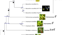 Different plant tissues were collected from several genotypes for genome sequencing, RNA-seq and marker assay. All plant material was immediately frozen and ground to powder in liquid nitrogen after collection. For genome sequencing, young leaves were collected from three hermaphrodite Vv vinifera (Merlot clone FPS 15; Black Corinth with parthenocarpic fruit FPS 02.1; Black Corinth with seeded fruit; Supplementary Fig. 12), four dioecious Vv sylvestris (male DVIT3351.27 collected from Armenia; female O34-16 collected from Iran; female DVIT3603.07 and male DVIT3603.16 collected from Azerbaijan), one dioecious male V. arizonica (b40-14), and one dioecious male M. rotundifolia (Trayshed). For RNA-seq, inflorescences were collected in April and May 2019 from vines at the University of California Davis (Davis, CA, USA). These times correspond to two developmental stages49: flowers pressed together (E-L 15) and full flowering with 50% caps off (E-L 23; Supplementary Fig. 13). Three genotypes were sampled, including Vv vinifera cv. Chardonnay clone FPS 04, male Vv sylvestris DVIT3351.27, and female O34-16. Floral buds were sampled from three inflorescences at E-L 15 (time 1). At E-L 23, pre- (time 2) and post-bloom (time 3) flowers were collected separately, each represented by three biological replicates. Young leaves from additional genotypes were collected for a marker assay. This included seven Vv vinifera, V. piasezkii and V. romanetii and two F1 populations (Supplementary Table 1). One F1 population was the result of a cross between the pistillate Vv vinifera F2-35 (Carignane × Cabernet Sauvignon) and V. arizonica b42-26. The other F1 population was produced by crossing female Vv vinifera 08326-61 (selfing of Cabernet Franc) and Vv sylvestris DVIT3351.27. The sexes of F1 individuals were evaluated by flower morphology and the presence of fruit.