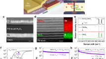 Considering that the extracted scaling exponents showed high similarity between InSe A- and V-FET, we further discuss the nature of the 1/f characteristics under the two conditions by combining the carrier number fluctuation and correlated mobility fluctuation in terms of the dynamic carrier trapping behaviour and the surface scattering54,55,56. The detailed descriptions are provided in the Supplementary Note 1. To discriminate the governing mechanisms of the noise source in the InSe devices under different environments, Fig. 3d plots the log-log scaled \(S_I/I_{\mathrm{ds}}^2\) as a function of drain current. The evolution of \(S_I/I_{\mathrm{ds}}^2\) for InSe A-FET tended to depend on the change of \(I_{{\mathrm{ds}}}^{{\mathrm{ - 2}}}\), which indicated that the surface effect dominated the carrier transport. This phenomenon validated the existence of charge trapping/releasing events at the InSe channel and dielectric interface, which was high-consistency with the HRTEM analysis. However, the observed \(S_I/I_{\mathrm{ds}}^2\) for InSe V-FET is inclined to mainly obey the variation of \(I_{{\mathrm{ds}}}^{{\mathrm{ - 1}}}\). The corresponding αSC, a mobility fluctuation related Coulomb scattering coefficient, was fitted to be 2.69 × 104 V s C−1 for InSe V-FET, which was ~100 times higher than that for InSe A-FET (2.95 × 102 V s C−1), indicating the bulk condition mainly governed carrier transport and fluctuations in InSe V-FET. Furthermore, the effective trap densities, Nit, which is composed of all the trap states from both the bottom interface and the top surface of the InSe channel in the present device configurations, were evaluated to visualize the process of charge transport in InSe FETs under the two conditions57. For a better comparison, the extracted values of Nit as a function of z/λ and gate voltages under two conditions are shown in Fig. 3e, where z and λ represent the trap depth and tunnelling distance parameter, respectively51. The Nit values were independent of z/λ under each applied gate voltage, which further portrayed the observed in the 1/f behaviour. The overall value of Nit for InSe A-FET was near 1014 eV−1 cm−2, at least an order of magnitude at least higher than that in the vacuum condition. Such a big difference of Nit values between the two conditions is believed to make the boosted charge trapping/detrapping events between the InOx interfacial layer and InSe channel in InSe A-FET, shedding more light on the evident surface effect under ambient conditions because of the formation of 2-nm-thick native InOx layer. On the other hand, we further conducted the in situ KPFM measurements to visually verify the charge trapping effect of InOx via examining the dynamic variation of the surface potential of InSe channel in InSe A- and V-FET (Fig. 3f). In the case of InSe A-FET, the recorded potential of InSe channel exhibits distinct difference under the read states (Vbg = 0 V) after the program and erase pulses, as well as a good reproducibility in 4 successive cycles, which shed light on the occurrence of the charge trapping/detrapping events in InSe A-FET during the program/erase process. In contrast, the potential difference in InSe V-FET could almost be ignored under several read states, hinting at its weak charge transfer behaviour. Thus we could determine the dominant role of the InOx layer in trapping/detrapping electrons in the proposed devices, which paves the way for the demonstration of memory and artificial synaptic features.