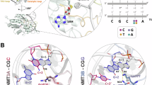 The interaction between DNMT3B and DNA involves a loop from the catalytic core (catalytic loop: residues 648–672), a loop from the TRD (TRD loop: residues 772–791), and a segment in the homodimeric interface of DNMT3B, known as the RD interface in DNMT3A42 (RD: residues 822–828) (Fig. 3c–e and Supplementary Fig. 8e, f). Each Zebularine (Z5/Z20′) is flipped into the active site of one DNMT3B subunit, where it is anchored through a covalent linkage with the catalytic cysteine C651 and hydrogen-bonding interactions with other catalytic residues (Fig. 3b). The cavities vacated by the base flipping of Z5/Z20′ are occupied by the side chains of V657 (Fig. 3c). The orphan guanine (G5′/G20) that originally paired with Z5/Z20′ is stabilized by a hydrogen bond between the backbone carbonyl group of V657 and the Gua-N2 atom (Fig. 3c), while the ZpG guanine (G6/G19′) is recognized by a hydrogen bond between the side chain of N779 and the Gua-O6 atom, as well as a water-mediated hydrogen bond between the side chain of T775 and the Gua-N7 atom (Fig. 3d). Both guanines also engage van der Waals contacts with catalytic-loop residue P659 (Fig. 3c). Aside from the CpG recognition, N779 forms a hydrogen bond with the T7′-O4 atom (Fig. 3d), suggestive of a role in recognizing the nucleotides at the +1 flank position. Furthermore, residues on the catalytic loop (N652 and S655), the TRD loop (Q772, T773, T776, K782, and K785) and the RD interface (R823 and G824) interact with the DNA backbone on both strands through hydrogen-bonding or electrostatic interactions (Fig. 3c–e and Supplementary Fig. 8e, f). Note that DNMT3L does not make any contact with the DNA (Fig. 3b), as previously observed for the DNMT3A–DNMT3L–DNA complex33 and it did not show strong effects on the flanking sequence preferences of DNMT3A or DNMT3B (Supplementary Fig. 9).