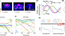 CoL was measured using IgorPro scripts utilising the SARFIA toolset. CoL trajectory area was calculated from the perimeter of the CoL excursion and expressed as a percentage of the area of the temporally integrated bioluminescence signal. Circadian bioluminescence and fluorescence signals were analysed using a manual peak identification and peak-to-peak period approach in the case of phase-mapping electrophysiology experiments (Fig. 2), fluorescence/bioluminescence experiments (Fig. 3) and optogenetics experiments (Fig. 6). Differences in phasing comparing pan-neuronal or targeted ArcLight and GCaMP6f were assessed statistically by ordinary one-way ANOVA with Holm-Sidak’s correction for multiple comparisons. Potential differences in aggregate period between Per2::Luciferase and pan-neuronal or targeted (VIPCre and VPAC2Cre) ArcLight/GCaMP6f were assessed statistically by paired t-tests. Differences in phasing, Rayleigh vector length, CoL trajectory, baseline and amplitude for pCry1-luciferase rhythms were assessed by unpaired t-tests. Differences in period for pCry1-luciferase rhythms between pan-neuronal (synapsin-Cre) and targeted (VIPCre and VPAC2Cre) conditions were assessed by ordinary one-way ANOVA with Holm-Sidak’s correction for multiple comparisons. Bioluminescence recordings from slice cultures in long-term PMT recordings were analysed to calculate circadian period length, amplitude, relative amplitude error (RAE) and goodness of fit (GOF) using the Fast Fourier Transform—Non-Linear Least Squares (FFT-NLLS) function in the BioDARE software47 (www.biodare2.ed.ac.uk).