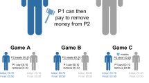 If people indeed use direct versus indirect punishment strategies in a conditional manner, what sort of decision rules do they employ? First, decision rules underlying punishment should be fine-tuned to the benefits of adjusting others’ behavior, which may be higher when (a) the offender is a highly-valued individual29 or (b) the violation is victimizing oneself (rather than someone else)30,31,32. Second, decision rules underlying punishment should be tailored to minimizing the risks of retaliation from offenders, which may be higher when (c) violations are more severe33 or (d) offenders are more powerful34. Of course, such cost-benefit calculations need not be conscious; (e) negative emotions may be a primary motivator of punishment9,35,36.