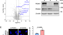 PEAK1 contains a putative proline-rich motif that fits the consensus for CRK binding31,32. To test whether this is involved in their interaction, we generated a mutant of PEAK1 in which this proline-rich region was disrupted (PEAK13PA) and we demonstrated that this nearly eliminated PEAK1 binding to CRKII by both co-IP and glutathione S-transferase (GST) pulldown assays (Fig. 6a, b; Supplementary Fig. 5c). Further analysis revealed that PEAK1/CRKII coupling occurred via the CRKII middle SH3 domain (Supplementary Fig. 5d). Indeed, comparison of the PEAK1WT and PEAK13PA BioID interactomes revealed that the PEAK13PA mutant no longer bound the CRK adapter proteins (Supplementary Data 5).