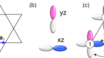 At this point, an important outstanding question is how the localization mechanism in the simple s-orbital kagome tight-binding model (Fig. 1a, b) manifests in the realistic d-orbital kagome lattice of CoSn. To address this aspect, we derived a DFT-based ab initio tight-binding model of CoSn (Supplementary Fig. 5), and use the kz = 0 flat bands to construct the real-space effective Wannier functions on the 2D kagome plane (see the Supplementary Note 3 for details). We construct the flat band Wannier function to retain the highest degree of symmetries possible (except those abandoned by the topological obstructions associated with nontrivial Z2 invariant and mirror Chern number; see “Discussion” below), which include a subset of important symmetries of the kagome lattice such as C6 rotational symmetry, xz/yz mirror symmetry, combined inversion/time-reversal symmetry, and combined xy mirror/time-reversal symmetry. As such, the Wannier functions we derived could serve as a basis for future analyses of interaction effects within the flat bands. The real-space orbital textures of the constructed flat band Wannier functions are displayed in Fig. 3e, f, while the corresponding spin textures are displayed in Supplementary Fig. 6. Several important points are apparent: (1) Due to the finite dispersion of the flat bands in CoSn, we could observe a finite charge density leaking out of the central hexagon unlike the ideal case in Fig. 1a. Nonetheless, the charge density rapidly and exponentially decays away from the central hexagon (insets in Fig. 3e, f), and 85% of total charge are confined in the first to third sites from the center. This provides the length scale of the localization ≈7 Å. (2) If we focus on the states at the central hexagon, chiral orbital textures could be observed around the hexagon, in which the d orbitals at the neighboring corners are aligned antiphase toward the site outside the hexagon. This is in reminiscence of the alternating phases in the compact localized states of s-orbital kagome model in Fig. 1a. In the Supplementary Note 3 and Supplementary Fig. 10, we have demonstrated that such orbital textures combined with fine-tuned multiorbital hopping parameters in the kagome lattice geometry suppress the charge leakage outside the hexagon and localize the real-space electronic wave functions. This finding implies that the destructive quantum phase interference from alternating phases in the s-wave kagome tight-binding model is transferred to the real-space chiral orbital textures in realistic d-orbital kagome model. This analogy unequivocally confirms the frustration-driven origin of the observed flat bands in CoSn. (3) The Wannier functions centered at the hexagon of the kagome lattice effectively forms a triangular lattice. We estimate the hopping t between Wannier functions at neighboring triangular lattice sites to be ≈15 meV reflecting suppressed kinetic energy of the flat band electrons (Supplementary Table 4). In this context, the exotic electronic phases recently derived from the Hubbard model on triangular lattices, including spiral magnetic orders, unconventional superconductivity, and quantum or chiral spin liquids, might be relevant to the flat bands in kagome lattice44,45,46.