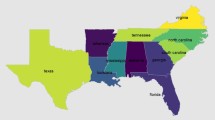 The piecewise linear function contains cutoff points that need to be determined during estimation. To obtain the cutoffs, we estimate Eq. (1) with different cutoff candidate values and then select the cutoffs that best fit the data. We place certain restrictions on the candidate values. Specifically, we fix the first cutoff at 10 °C and then search for two cutoffs, one between 20 °C and 35 °C and the other between 36 °C and 43 °C. Supplementary Table 1 presents the goodness-of-fit measure for our five key dependent variables—the overall LCR and the four cause-specific LCRs—and the corresponding two temperature cutoffs. For the overall LCRs, the first cutoffs are 27 °C for corn and 28 °C for soybeans. The cutoffs for heat, drought, and excess moisture losses are similar but a bit higher, and the cutoffs for cold-related losses are lower at 24 °C and 36 °C. The warming effects are obtained by estimating \(f(\bar{{\tau }_{i1}},\hat{\beta })-f(\bar{{\tau }_{i0}},\hat{\beta })\), where \(\bar{{\tau }_{i1}}\) is the vector of the averages of temperature variables under 1 °C warming scenario, \(\bar{{\tau }_{i0}}\) is the vector of the average of the observed temperature variables, and \(\hat{\beta }\) is the vector of estimated coefficients for the piecewise linear function of temperature effects. We cluster standard errors by year for our main specification. All regression analyses were conducted using the statistical software Stata/SE 15.
