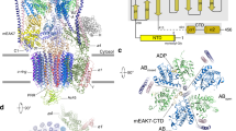 In addition to subunit e2, two α-helices associated with subunit a1 have been observed at the edge of the c-ring (Figs. 1c and 3a). Because two analogous α-helices have been identified as subunit f in the scVo structure, we followed this nomenclature and named these helices as subunit f. To date, the function of subunit f is unknown, and knockout of this subunit does not affect the function of V-ATPase in yeast. Mass spectrometry results and our cryo-EM data of the btV-ATPase indicate that subunit f may be the RNAseK that was shown to associate with V-ATPase32. The specific function of RNAseK in V-ATPase still requires further characterization.