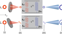 Structured light has recently gained increased interest in that it can accommodate the production of uniquely propagating beams of light1,2,3,4,5. One particularly interesting aspect is the ability of a structured beam to carry orbital angular momentum (OAM)6,7,8,9,10,11. One form of momentum is a simple Gaussian beam dot that can rotate in a circular fashion as it propagates, illuminating a ring shape12,13,14; this OAM is similar to revolution around a central axis. A second form of momentum is a subset of Laguerre–Gaussian (\(LG_{\ell ,p}\)) beams in which the phasefront twists in the azimuthal direction as it propagates15,16. The amount of OAM (\(\ell\)) is the number of 2π azimuthal phase changes, and p + 1 is the number of concentric rings on the intensity cross section for \(\ell \,\neq \, 0\). The beam rotates around its own beam center with a ring-like vortex intensity profile (Fig. 1d, h). This second type of OAM is similar to rotation. Indeed, the earth propagating around the sun exhibits both rotation around its own Earth center and revolution around a solar central axis17.
