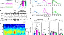 Electrophysiological activity was acquired using the Powerlab Labchart system (ADI instruments) at 4 kHz. Data were analyzed using custom MATLAB scripts utilizing functions available in the Fieldtrip and EEGLAB toolboxes. Raw LFPs were down-sampled to 1000 Hz and bandpass filtered between 0.7 and 300 Hz. Spectral analysis was conducted by applying the Hanning taper method with 1.5 s windows and 95% overlap. Cross-power spectrum (CPS) was calculated as the averaged absolute value of the cross-spectrum \(( {S_{{\mathrm{xy}}}} )\) between BLA and PFC: \(CPS = \frac{{{\mathrm{\Sigma }}\left| {S_{{\mathrm{xy}}}} \right|}}{N}\). Coherence (coh) and imaginary coherence (iCoh) between BLA and PFC LFPs was calculated as: