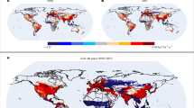 Global soil loss estimates were taken from Borrelli et al.32 using the RUSLE-based Global Soil Erosion Modeling platform (GloSEM), a modified large-scale Geographic Information System (GIS) version (RUSLE201567) of the Revised Universal Soil Loss Equation (RUSLE68) model. RUSLE belongs to the so called detachment-limited model types where the soil loss (here synonym to RUSLE soil loss69) is due to inter-rill and rill erosion processes. The long-term annual soil loss rates (Mg ha−1 yr−1) refers to the amount of sediment that reaches the end of a specified area (cell) on a hillslope that experiences loss of soil by water erosion. The modeled area does not, in any way, include areas of the slope that experience net deposition over the long term. This is because the displaced soil amount is not routed downslope across each cell from hillslopes to the sink area or the riverine systems through a transport/deposition capacity module. Borrelli et al.32 estimated soil loss from croplands as \(17_{ - 0.7}^{ + 1}\) Pg yr−1 (referring to 1.43 billion ha cropland). For a detailed description of soil loss data used in this study please refer to Borrelli, et al.32.