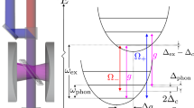 Coherent self-oscillation in cavity optomechanics is attained either when the external cw laser excitation is blueshifted with respect to the cavity mode in a single-cavity system or, in a coupled cavity system, when the higher cavity mode is excited27. The polariton BEC as an internal coherent source cannot thus, by itself, induce self-oscillation, because both Stokes and anti-Stokes processes would be equally probable. In our experiments, this symmetry is broken through the coupling of the BEC to the redshifted neighbor traps. Figure 3b shows details of the spectra from Fig. 3a, presented as a function of the detuning with respect to the BEC emission. The clearly resolved sidebands appear precisely when one of the neighbor traps is red-detuned by integer numbers of \({\nu }_{{\rm{m}}}^{{\rm{0}}} \sim 20\) GHz. The experimental observations can then be understood as follows: (i) the optomechanical interaction pumped by a confined BEC coupled to a precisely red-detuned neighbor trap (equivalent to a polariton population inversion) induces self-oscillations at the harmonics of the fundamental vibrational frequency \({\nu }_{{\rm{m}}}^{{\rm{0}}}=20\,\) GHz, and (ii) these coherent oscillation back-acts by modulating the BEC, thus leading to the observed sidebands. Furthermore, a closer look at Fig. 3b shows that the intensity of the phonon sideband increases when the neighbor trap is red-detuned by even numbers of \({\nu }_{{\rm{m}}}^{{\rm{0}}} \sim 20\) GHz: \(\delta \nu =-2{\nu }_{{\rm{m}}}^{{\rm{0}}} \sim -40\) GHz, \(\delta \nu =-4{\nu }_{{\rm{m}}}^{{\rm{0}}} \sim -80\) GHz, and \(\delta \nu =-6{\nu }_{{\rm{m}}}^{{\rm{0}}} \sim -120\) GHz. This observation points to the relevance of both linear and quadratic terms in the optomechanical interaction30,33, as previously described, e.g., for the membrane in a cavity configuration34,35, a geometry to which the QWs in a cavity we are describing here can be mapped. Note that the transition to the self-oscillation regime could be controlled either by tuning the neighbors’ adequate energy level by the proper design of the system, so that their detuning is resonant with the mechanical frequency at a certain power, or by including an additional nonresonant pump laser to independently fine-tune the neighbors fundamental modes energy.