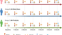 After completing the screening assessment (from −2 weeks to −3 days), eligible participants were given an oral broad-spectrum antibiotic (gentamicin sulfate 80 mg twice daily) for 7 days during the run-in period, to improve probiotic colonization34. Then, the participants were randomly assigned into one of the following four groups in a 1 : 1 : 1 : 1 ratio as follows: BBR (0.6 g per 6 pills, twice daily before meal) plus probiotics (4 g per 2 strips of powder, once daily at bedtime) (Prob + BBR), probiotics plus Plac (Prob), BBR plus Plac (BBR), or Plac plus Plac (Plac). Treatments were administered for 12 weeks and patients visited the centre every 4 weeks until the end of the study. The randomization procedure was stratified by age group and utilized a block size of eight, and the random numbers were generated by utilizing a validated interactive Web-based Response System, which was maintained by an independent data manager. The study personnel and participants were blinded to the assignment of treatment arms.