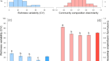 We determined the amount of C stocks and C fluxes in all soil samples as surrogates of climate regulation (soil-atmosphere CO2 feedbacks). The concentration of soil total organic C was determined by colorimetry after oxidation with a mixture of potassium dichromate and sulfuric acid36. Bulk density was determined in the field at the plot level as the average from three soil cores. Using this information, we calculated C stocks (kg C m−2) to 10 cm depth. Note that the concentrations of total organic C were strongly correlated with those of total N (ρ = 0.90; P < 0.001, n = 435) across samples, so we kept only soil C for statistical modeling. Soil respiration was determined on composite soil samples per plot by quantifying the CO2 released during 16 days from 1 g of soil sample incubated at 28 °C at 50% of water-holding capacity in 20-mL glass vials in the dark, following a 1-week pre-incubation37.