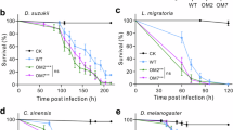To determine whether this effect could be observed in fruit flies other than domesticated Canton-S D. melanogaster strains, we repeated the spore-feeding experiment with 6 outbred fruit fly strains from the D. melanogaster Genetic Reference Panel (DGRP)37. As shown in Supplementary Fig. 1, the result was the same: the six outbred D. melanogaster strains were equally sensitive to WAC-288 spores such that all larvae were killed prior to completing development. We further repeated the experiment with D. virilis, D. suzukii, D. yakuba, D. simulans and D. pseudoobscura. Again the result was the same: the larvae of all five species died in the presence of the Streptomyces spores; none of them completed development to adults.
