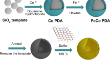 The morphology and chemical composition of the as-prepared samples were observed by field emission scanning electron microscopy (FESEM, Zeiss Supra 55VP), transmission electron microscopy (TEM, Tecnai G2 F30 S-TWIN). X-ray diffraction (XRD) measurements were carried out by using a scanning step of 0.04° per second in the 2θ range from 10° to 80° (Bruker D8 Discovery XRD). X-ray photoelectron spectroscopy (XPS) measurements were performed on an ESCALAB250Xi (Thermo Scientific, UK) equipped with mono-chromated Al K alpha (energy 1486.68 eV). The BET specific surface area and single-point pore volume were obtained from nitrogen adsorption isotherms measured at −196 °C using a nitrogen sorption instrument (ASAP 2460 Micropore Physisorption Analyzer). Prior to nitrogen adsorption measurements, the samples were degassed at 250 °C overnight. Raman spectra were obtained from a Renishaw inVia Raman spectrometer system (Gloucestershire, UK) equipped with a Leica DMLB microscope (Wetzlar, Germany) and a Renishaw He-Ne laser source producing 17 mW at 633 nm. Thermogravimetric analysis (TGA) was performed with a 2960 SDT system. X-ray absorption fine structure (XAFS) measurements of the Co K-edge were performed at the 1W1B beamline of the Beijing Synchrotron Radiation Facility (BSRF) in transmission mode. The X-ray was monochromatized using a double-crystal Si (111) monochromator and the energy was calibrated by a cobalt metal foil for Co K-edge. Cobalt foil and CoPc were used as the reference substance. The XAFS data was analysed using the WinXAS3.1 program. Cobalt content in HC particles was determined by Inductively Coupled Plasma Optical Emission Spectrometry (ICP-OES).