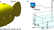 Experiments with goldfish were conducted in a flow tank (Loligo system, Tjele, Denmark) at the Max Planck Institute of Animal Behavior in Konstanz, Germany. The effective test area of the flow tank is 0.25-m-wide, 0.875-m-long and 0.25-m-deep. A mirror was put at the bottom of the tank at 45° respect to the horizontal plane to allow the camera to record the bottom-view from one side of the tank (Supplementary Fig. 15). Bottom-view and lateral-view cameras (BASLER acA2000-165umNIR) were used to film the fish movements at 100 frames per second. The resolution was set as 2048 × 1058. Videos were collected using a commercial code (Loopbio, Austria).