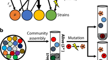 where M is the total number of species. We use the generalized Lotka-Volterra dynamics, where the mutualistic interactions are described by Holling type II functional response28. This implies that we track the mean fitness of individual species, regardless of intraspecific difference. The mutualistic and competitive interaction strengths are encoded in the coupling matrices {γij} and {βij}, respectively (see Methods).